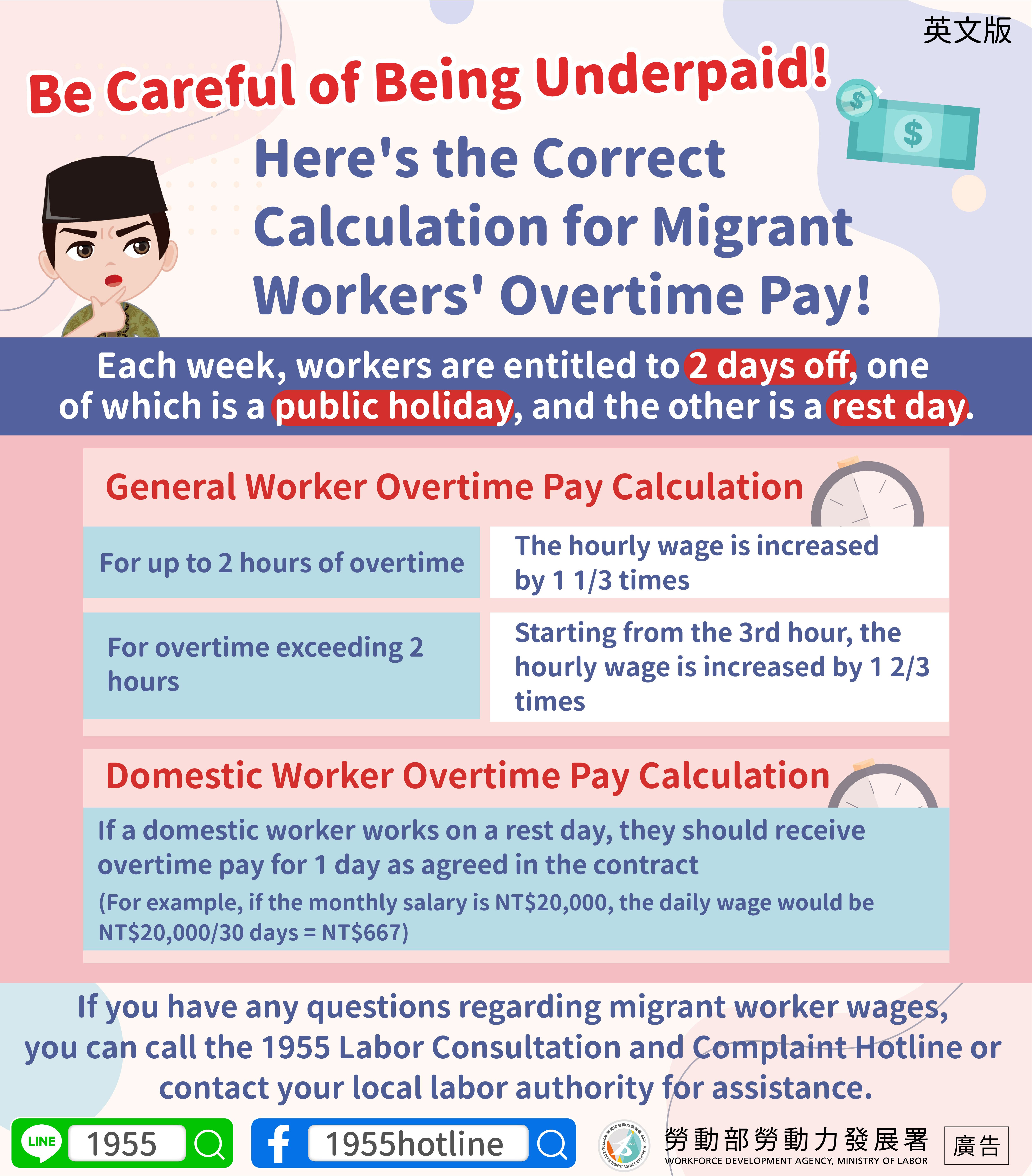 If you have any questions regarding migrant worker wages, you can call the 1955 Labor Consultation and Complaint Hotline or contact your local labor authority for assistance.