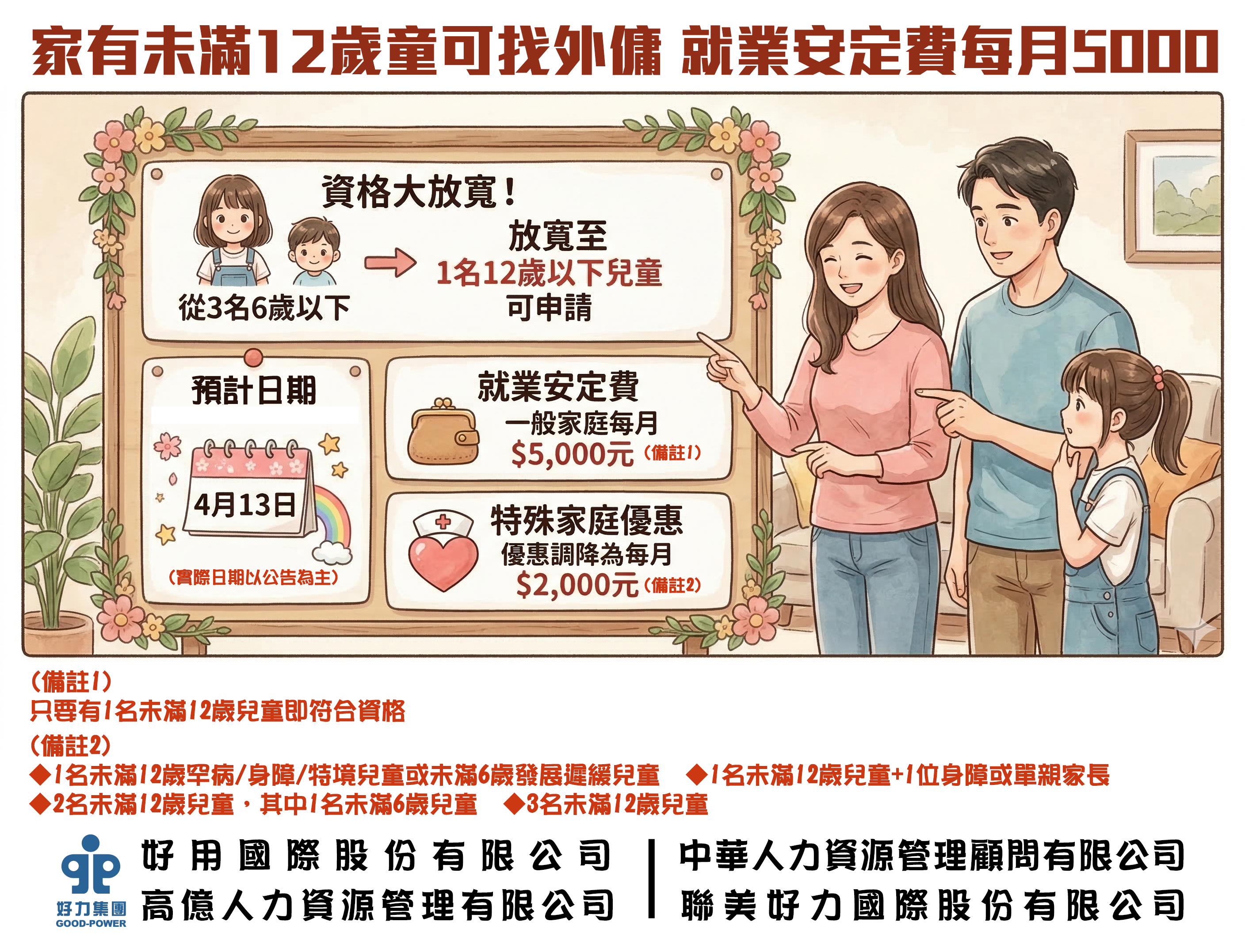 為應對少子化與當代雙薪家庭育兒的困難處境,勞動部將在19日行政院院會陳報「多一個幫手,少一分疲憊-勞動部放寬外籍幫 傭申請條件,優先協助特殊家庭減壓力」報告,將把現在申請外籍幫傭的資格大幅鬆綁為,家中有一名未滿12歲兒童即符合資格,且還有如兒童數量較多等多情境的特殊需求家庭狀況,將可降低每月繳納就安費的額度且優先審批,整套方案預計4月13日能開始受理。